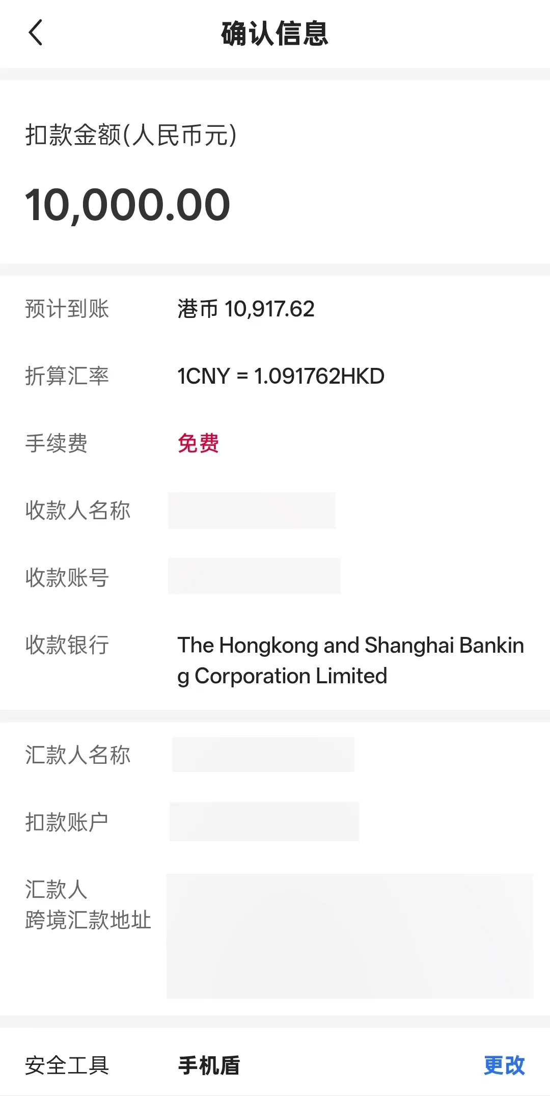 到账货币可灵活选择人民币或港币,银行会自动显示兑换汇率。确认转账信息后,即可实时汇款成功,资金一秒到账。